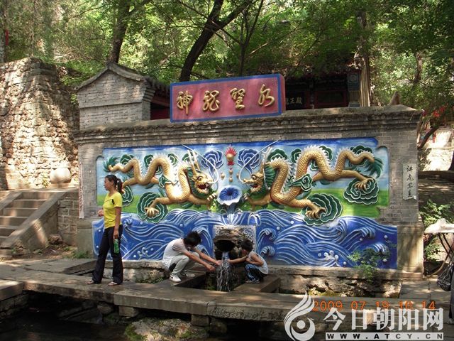 槐樹洞號稱朝陽的“小千山”,又號遼西的“避暑山莊”,全因洞前那眼源源不絕、已流淌億萬年的圣泉。因為圣泉常年的奔涌,使涼氣四散到周圍的空氣中,與槐風(fēng)融匯、翻攪,才帶給這幽幽古剎沁人心脾、沁入骨髓、享用不盡的絲絲清爽。圣泉的泉口直徑達半米,現(xiàn)如今被塑造成龍口形,背后九龍壁赫然矗立,上刻乾隆皇帝“神龍圣水”的四字手書。泉的前面是四四方方的、總面積近千平米的兩個小池。池水清澈、碧綠,池中幾千尾金魚游戈嬉戲,池邊幸福的游人們或買賣或下棋或打牌或閑談,個個神清氣順、悠然自得。我拿著水瓶領(lǐng)著三歲的女兒來到九龍壁前,女兒勇敢地接過水瓶放到“神龍圣水”的“龍口”旁,泉水汩汩地噴涌,一會兒一大瓶甘冽、圣潔的泉水就遞到我們爺倆兒的嘴邊。太美了!太甜了!太清了!太棒了!“神龍圣水”名不虛傳,“神龍圣水”是上帝對遼西這片干渴的土地的無私饋贈,是大自然的杰作、勞動人民汗水的結(jié)晶!