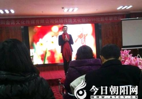 2015年12月28日下午,在遼寧省朝陽市朝陽金諾文化傳媒有限公司隆重舉辦了一場“朝陽金諾文化傳媒有限公司弘揚傳統(tǒng)文化暨迎新春聯(lián)歡會”。參加本次活動的有朝陽金諾文化傳媒有限公司的全體職工,來自愛尚家居、怡然廣告公司等十多個企事業(yè)單位的法人代表、社會各界人士、傳統(tǒng)文化老師以及鐘愛傳統(tǒng)文化的善男信女等百余人。