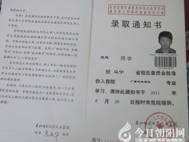 第二年,他再次來(lái)我這里培訓(xùn),繼續(xù)參加藝考,再次沖刺高考文化課。功夫不負(fù)有心人,經(jīng)過(guò)一年的等待,一年的打拼,一年的臥薪嘗膽,張建終于被東北師范大學(xué)人文學(xué)院廣播電視編導(dǎo)專業(yè)錄取。