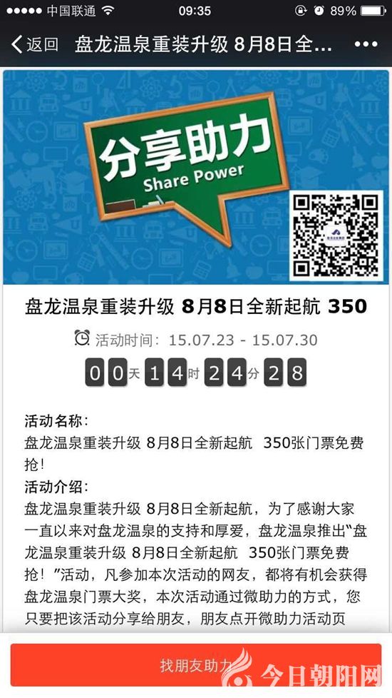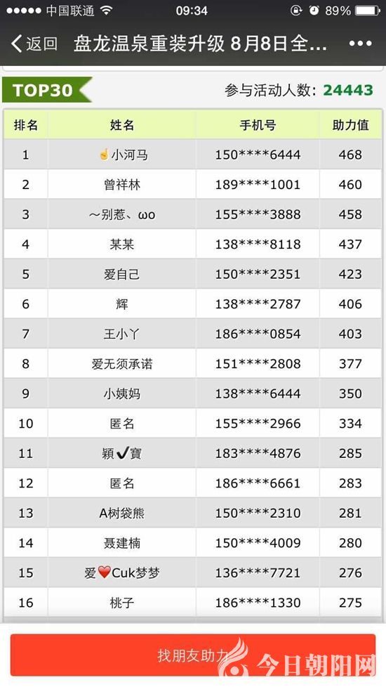 盤龍溫泉重裝升級,8月8日開業(yè)在即,特在微信上推出了“微助力·贏門票”活動,倒計時啦,目前可用的時間也只有兩天多了,參加活動的朋訪們加油了!活動23日上午正式開始,微助力程序一開啟便迅速成為朝陽市民微信中出現(xiàn)頻率最高的消息,截至7月29日早9:35已有24443人參加,想要進入前30名,至少得有220多個朋友幫助助力,目前第一的網(wǎng)友已經(jīng)有近468個朋友助力,可以說是目前朝陽地區(qū)熱度最高的一次活動。微助力的排名仍在變化中,活動截止到7月30日,朋友們,再加把勁,盤龍溫泉的豪華門票大禮等著大家呢!截至7月25日早9:35的排行榜