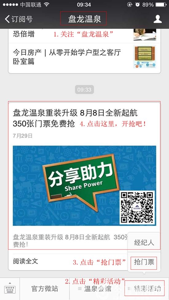 1、關注盤龍溫泉微信公眾號(微信號panlongwenquan),進入公眾帳號,點擊右下角"精彩活動",在點擊“搶門票”即可進入活動頁面,填寫自己的電話號碼即可參加。
