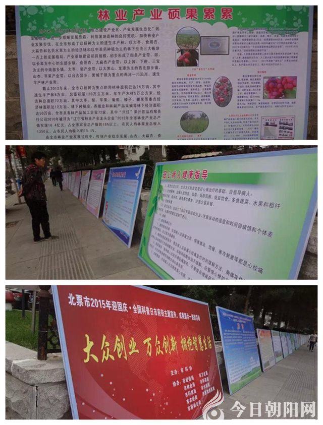 國慶在即,為慶祝國慶,全面落實北票市委宣傳部《關于舉辦2015年北票市科普周活動的通知》,由北票市科協(xié)主辦,北票市經信局、林業(yè)局、科技局、農經局、移動公司、衛(wèi)生局、環(huán)保局、水利局、畜牧獸醫(yī)局協(xié)辦的“北票市2015年迎國慶.全國科普日市府街主題宣傳、成果展示一條街活動”在市府街拉開帷幕。各單位均從本行業(yè)的角度出發(fā),貼近百姓生活,著眼長遠發(fā)展,加強了科普知識的主題宣傳,展示了最新的科普成果,叫人耳目一新,圖文并茂的展板吸引了過往行人駐足觀看,成為市府街一道亮麗的風景。