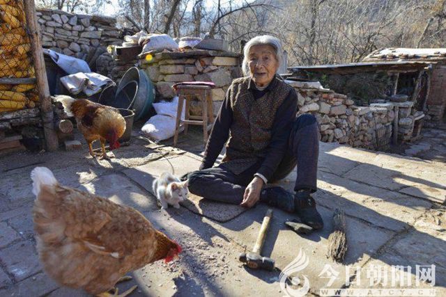 走進(jìn)村,見一座一座陳舊老式的門樓,木做的大門和半截小矮木門,執(zhí)著守著一幢幢老宅,門上依稀可見殘留的褪色的春聯(lián)和福字,十幾戶集中連片的舊式房屋,秫秸的房頂,木格棱的窗戶,房檐下掛著一串串紅辣椒,這不由我想起兒時(shí)的小山村,雖“人”字型青瓦的房屋與這里平房民居建筑風(fēng)格不同,但其它并無二致,可見所謂傳統(tǒng)的東西,其精髓都是一樣的,它折射出的是一個(gè)民族一個(gè)國家、一個(gè)地域大同小異的文化風(fēng)情。我們6人的慕名到訪,驚動(dòng)了石窯子溝村的村民。他們?nèi)缬舆h(yuǎn)方客人一樣,熱情招呼我們這些古村來客“到家里坐坐”。我們?nèi)サ牡谝粦羧思遥怯幸晃?3歲高齡老人的人家,進(jìn)得院門,可從石砌的斜坡和臺(tái)階兩個(gè)路徑進(jìn)院,老人正坐在院中央用一把小錘子砸一塊狀食物喂食圍在她身邊的幾只公雞母雞,一只小花貓溫存地臥在老人的腿邊,愜意而安詳。見我們進(jìn)去,老人麻利地站起身,一邊拍打衣服上的谷皮,一邊抱著小花貓邀請我們“屋里坐”,老人的女兒女婿端出一盤梨,讓我們品嘗。推辭間,老人已把梨塞到每個(gè)人的手中,讓我們不忍拒絕。眼前的老人精神矍鑠,一雙三寸金蓮支撐著挺拔的身材,眉目清秀慈善,笑臉上雖布滿歲月的紋理,但絲毫不像年過九十的山村老婦,我們在驚嘆老人的高壽和她年輕時(shí)該是多么標(biāo)致美麗的女子時(shí),特別矚目她那雙小腳,我甚至用我只穿34尺碼的腳和老人腳對(duì)腳比量,可我自認(rèn)為很小的腳仍大出老人許多,于是幾個(gè)攝友長槍短炮對(duì)準(zhǔn)老人的三寸金蓮開始拍攝,我則抱著老人的肩膀與其合影,為了沾一點(diǎn)老人長壽的福氣。