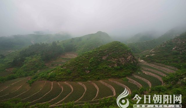 盛情難卻。我們坐在曾經(jīng)熟悉不過(guò)的熱乎乎的土炕上吃過(guò)農(nóng)家飯,便在曲振生老人的兒子曲大哥的帶領(lǐng)下,前往八盤(pán)溝的南天門(mén)溝。走出八盤(pán)溝村,我們踏上一條鋪滿石子的山路,路旁就是一層層的梯田,綿延到雨后薄薄的云霧繚繞的大山高處,讓我們初去八盤(pán)溝的五位同行者不時(shí)發(fā)出嘖嘖驚嘆,此情此景,一首兒時(shí)父母總在我的耳邊哼唱的“一座座青山緊相連,一朵朵白云繞山間,一片片梯田一層層綠,一陣陣歌聲隨風(fēng)傳......”的歌兒悄然在我心中唱響,這首歌分明就是唱給八盤(pán)溝的。此時(shí)的八盤(pán)溝,雨后的霧和天空的白云連在一起,在峰巒疊嶂之間時(shí)聚時(shí)散,時(shí)淡時(shí)濃,自如灑脫;一層層梯田上種植的玉米、高粱、谷黍、向日癸、大蔥等多種農(nóng)作物,呈現(xiàn)出一派豐收的景象。然而最巧合的是,進(jìn)溝不遠(yuǎn),便現(xiàn)一幢很舊的樓房。曲大哥說(shuō),這里曾駐扎過(guò)部隊(duì),近幾年才搬走。于是我的眼前又一次出現(xiàn)兒時(shí)為修大寨田給“解放軍叔叔”送茶水的情景。