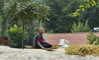 初秋的清晨,我們頂著淅瀝的小雨,驅(qū)車(chē)前往八盤(pán)溝,首先來(lái)到曲振生老人的兒子家。為了看八盤(pán)溝的夜景,厚書(shū)記與一位攝影的朋友先我們一晚到達(dá)這里。這是一個(gè)古樸祥和的村莊,村里還保留著很多石頭壘砌的房屋和院墻,蘋(píng)果、梨、大棗等即將成熟,它們?cè)谇镉甑淖虧?rùn)下顯得光鮮而水靈。村里隨處可見(jiàn)的楊柳榆槐,更是蒼翠欲滴,絲毫沒(méi)有秋天的衰落凋零。88歲高齡的曲振生老人剛剛過(guò)世一年,老人的兒子兒媳,還有書(shū)法專(zhuān)業(yè)碩士畢業(yè)的孫女,都深得曲振生老人的言傳身教,淳樸、善良、執(zhí)著。盡管我們已在市內(nèi)吃過(guò)早餐,但菜包飯、小米粥、大餅子、煎餅、大蔥、蘿卜纓蘸醬、燉大豆腐等具有農(nóng)村特色的飯菜,還為我們擺在桌上。一家人熱情地要我們?cè)俪渣c(diǎn)兒,為上八盤(pán)溝的南天門(mén)溝備足體力。豐盛的早飯、質(zhì)樸的話語(yǔ),讓我們這些在農(nóng)村長(zhǎng)大的人,突然間就有了回歸的感覺(jué)。那是小時(shí)候在故鄉(xiāng),鄉(xiāng)里鄉(xiāng)親間最樸素最自然的感情,就像那滿桌的農(nóng)家飯菜,帶著泥土的清香,濃縮著故園的曾經(jīng)。
