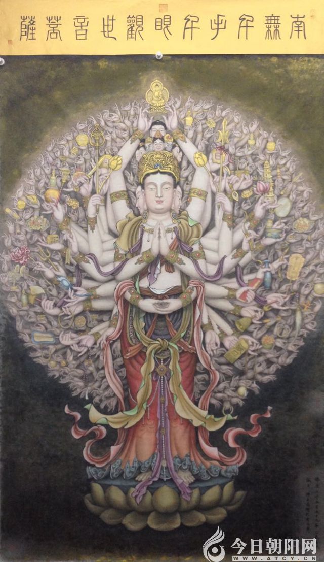 畫者心中閃耀的,是觀世音菩薩愿力成道所顯現(xiàn)的如來智慧德性的自然法相,所持法器是歷劫修行法跡之明證,她救苦救難的大悲心遍法界、盡虛空……未能言語道破,唯心感通,更未能在紙上表現(xiàn)無盡菩薩意……南無千手千眼觀世音菩薩!