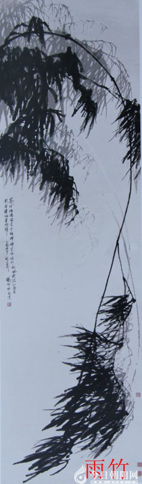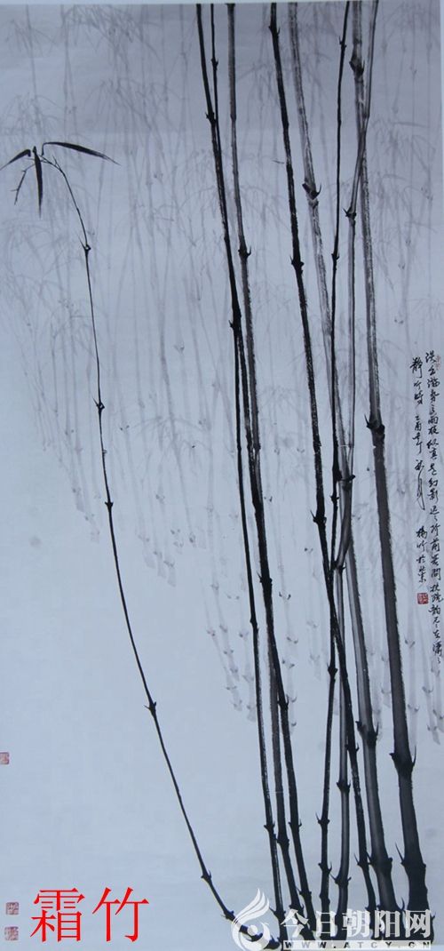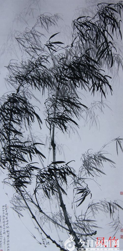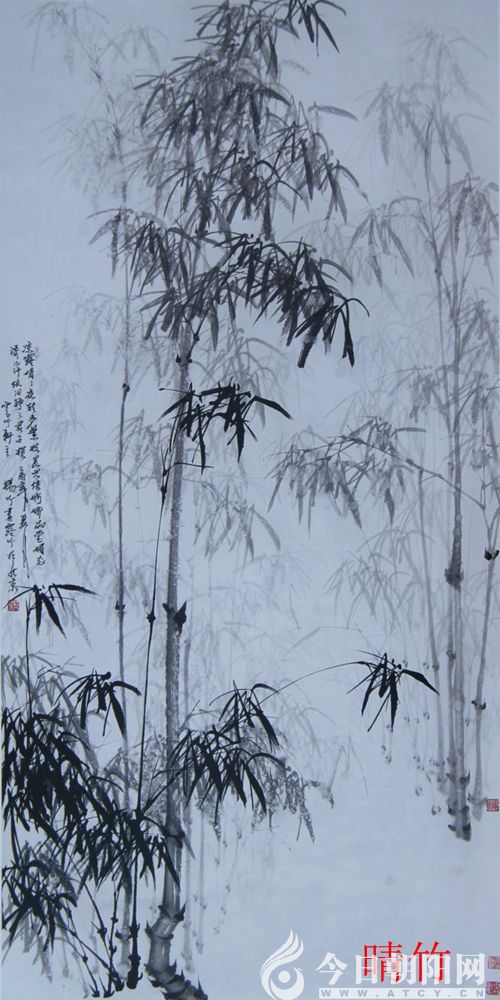 筆墨技法的創(chuàng)新,源于生活的積淀和認知的升華。筆墨是中國畫的標識,筆墨在完成造型功能的同時,又與造型分離形成獨立的審美元素。筆墨的特殊語匯與法式概括起來就是"皴、擦、點、染"。筆,起落停頓,骨法勾描的皴與擦以搭身架通血脈,表陰陽,現(xiàn)骨力,生律動;墨,輕重緩急,水暈?zāi)珵a的點與染以長皮肉成像貌,藏氣韻,顯剛?cè)?,生精神。筆墨之美迥于自然之美,更是繪畫之美與攝影之美的重要界別之一。繪畫通過這種特殊語匯導(dǎo)引欣賞者從看畫的層面進入讀畫的境界,形成筆墨情趣。楊竹說,竹看似簡單,卻是筍、竿、節(jié)、枝、葉一應(yīng)俱全的小宇宙。竿、枝任筆皴擦,筍、節(jié)、葉任墨點染,創(chuàng)作空間任馳騁。似這樣既合于人道。又合于畫道,讓筆與墨在同一對象中同時各顯神通的載體,在大自然中并不多見。歷代畫竹,竹桿中間長、上下短,只畫彎節(jié)不彎桿,叫“竹竿中長上下短,只須彎節(jié)不彎竿;竿竿點節(jié)休排比,濃淡陰陽細審觀。”竹桿畫完以后,開始點節(jié)。節(jié)是正八字,反八字。楊竹完全顛覆了傳統(tǒng)畫竹筆法,全部變成了自己的東西。無論是竹節(jié)、小竹芽,毫無古人蹤跡。在竹桿的畫法和竹葉的畫法上,已完全形成了自己的風格,全部采用中鋒用筆,像竹葉,都是像寫字一樣寫出來的。比如鄭板橋畫的墨竹,風、晴、雨、露,只是竹葉的方向有點變化。歷代畫竹子也都是這樣。而楊竹畫的風、晴、雨、露、霧、雪、霜、冰這八種竹子完全是自己的創(chuàng)新了。露竹,不僅竹葉的方向不一樣,而且葉子上就是有露珠。晴竹,就亭亭玉立,文文靜靜。雨竹,就是葉子上濕漉漉的樣子。露竹,竹桿、竹葉上都有露水。霧竹,就是朦朦朧朧,霧里看花,有遠近虛實。雪竹,就是滿天大雪,竹子上也落了很多的雪,竹桿還很挺拔。霜竹,竹桿、竹葉上都是白霜了。冰,就是春天的時候雪化了,又凍起來了,有透明感。