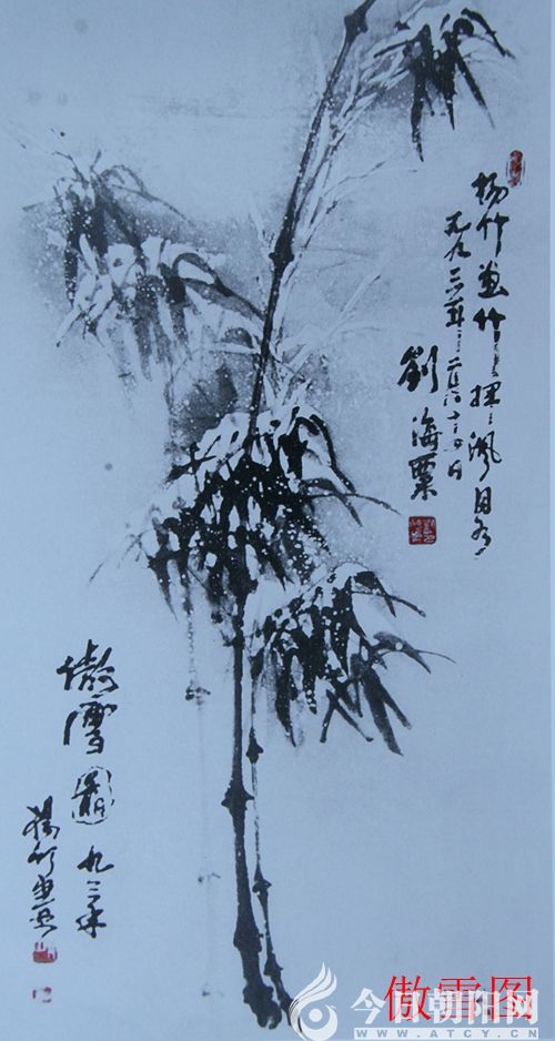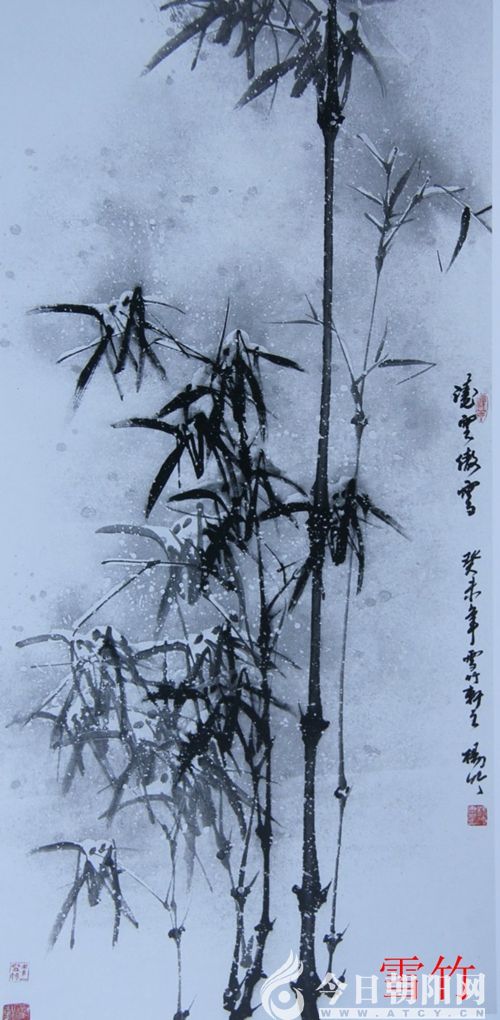 看竟雪中竹逸品,寫就高風亮節(jié)圖。中華竹文化博大精深,源遠流長。做到詩、畫一體,就要通過觀察竹子,在大自然中吸取營養(yǎng),然后才開始作畫。楊竹先生深知文化的內(nèi)涵和力量,他養(yǎng)竹、賞竹,寫竹,并熟讀古人有關(guān)竹子的詩畫。中國是詩的國度,詠物詩、詠竹詩既多且雅,更是獨具特色。詩與竹的精美結(jié)合,譜寫了中華竹文化的燦爛篇章。楊竹不但通讀還自己作詩詠竹,詮釋竹子高貴的品格和堅忍不拔的毅力。比如他給萬里老人題的那句話:“寫此青竹兩三竿,挺然屹立不畏寒。虛心有節(jié)凌云志,鏖戰(zhàn)風霜老愈堅。”一下把竹子和萬老的性格寫活了。楊竹平素在風里、雨里、雪里、霧里進行仔細的觀察,不僅能把竹子的高貴品格和個性給它畫出來,他還通過撰寫詩句把各種姿態(tài)的竹子人格化。如他寫風竹:“波濤藝海幾飄蓬,雅竹關(guān)門學(xué)畫功。”寫晴竹:“萬頃瑯玕壓碧云,清風幽興渺無垠。”寫雨竹:“長空漠漠雨霏霏,莖自沉沉葉自垂。”寫露竹:“枝枝葉葉自成排,嫩嫩枝枝向上裁”。寫霧竹的:“向陽亭亭立,倩影輕輕搖”。寫雪竹:“周天守徹玉龍飄,素葉瓊枝輕曳搖。”寫霜竹:“墨濃酒醉意闌珊,下筆不思這個難。”寫冰竹的:“亭亭月下陰,挺挺冰中節(jié)。”楊竹的畫作是一畫一詩句,句句見真功。