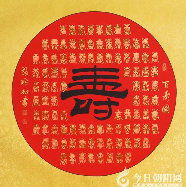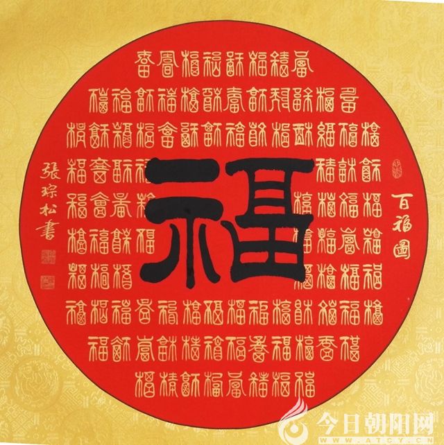 縱觀張琮松的金粉隸書和篆書,除去他經(jīng)典的隸書《心經(jīng)》、《大悲咒》、《金剛經(jīng)》、《華嚴(yán)經(jīng)》、《道德經(jīng)》等經(jīng)文之外,金粉隸書《出師表》、《陋室銘》和金粉篆書《百福圖》、《百壽圖》、《般若波羅蜜多心經(jīng)》等作品也堪稱當(dāng)世經(jīng)典之作。作者在創(chuàng)作過程中更多的是承襲了中國書法的文脈,他在傳統(tǒng)素書的基礎(chǔ)上用現(xiàn)代審美意識豐富、完善了書法藝術(shù)的創(chuàng)作手段,改墨汁為金粉,改白宣為藏藍(lán)或大紅。在這些細(xì)微的變化中,不僅寫出了視覺的沖擊,更重要的是寫出了書家所思所想,為其作品注入了寬博的哲學(xué)內(nèi)涵。在創(chuàng)作過程中,張琮松通過抽象的筆墨線條來抒發(fā)主觀情懷。特別是在《出師表》一文中,作者通過字體結(jié)構(gòu)的變化和線條的飛揚(yáng),突出了諸葛亮親賢遠(yuǎn)佞的忠心激情,令人慷慨沉思,動(dòng)人心魄。在《陋室銘》一文中,作者借物喻理、托物抒情。其筆墨線條安貧樂道,以靜為動(dòng),用筆老辣,高雅脫俗,可與廟堂經(jīng)典相媲美,真正恪守了他“出于法而守于道”的創(chuàng)作原則。他將儒家道統(tǒng),釋家超脫與道家物化寄情于筆墨之中,這又何嘗不是書家的心靈告白和情感寄托呢?