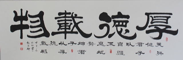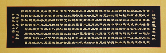 他認(rèn)為,書法就是心靈的寫照,心不正則書不正。他在書法創(chuàng)作和經(jīng)文抄錄中,總會(huì)以一顆平常心去解讀頓悟字句的內(nèi)涵,理性架構(gòu)作品布局,詮釋傳統(tǒng)書藝精髓。他的書法作品線條嚴(yán)肅而不拘泥,轉(zhuǎn)折靈動(dòng)而不張揚(yáng),布局勻稱而不呆板,筆墨圓潤而不臃腫,其一橫一豎皆見佛理,一撇一捺皆有禪趣。譬如他的經(jīng)典金粉隸書作品《般若波羅蜜多心經(jīng)》和《金剛經(jīng)》,其書風(fēng)穩(wěn)健勻凈,溫溫和雅,寬博大度。他的用筆均勻順暢,橫筆勻長,豎筆簡短,波畫明晰,撇捺內(nèi)斂,張弛有度,蠶頭燕尾樸茂厚重;其字結(jié)構(gòu)緊湊,字字勻稱,線條溫潤光滑,勁健骨感。他的經(jīng)文作品拒絕飛白,結(jié)字和章法布白也極為均勻滿實(shí),處處彰顯《曹全碑》、《乙瑛碑》氣韻秀麗,正中寓欹,平和簡靜的印痕。