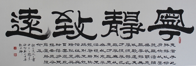 寧靜寬博,移情于墨。書法是一種抽象的線條藝術(shù),通過點(diǎn)橫豎撇捺的變化造境升華,表現(xiàn)出作者獨(dú)特的審美追求,再現(xiàn)哲思禪理,人文情懷。張琮松不是一位追求表現(xiàn)主義的書法家,但他卻在不經(jīng)意間用抽象的線條,具象的布局,表達(dá)了書家主觀訴求和心靈的吶喊。他移情于墨,筆下線條所構(gòu)成的每個(gè)字的點(diǎn)畫、結(jié)體和字與字的聯(lián)系形成的章法,以及整幅作品的氣勢,用紙的色彩等,都躍動(dòng)著書家的精神生命與激蕩情感。而他采用表達(dá)的方式是寧靜的,高遠(yuǎn)的,寬博的,深邃的;其味道是獨(dú)特的,渾厚的,樸茂的,端莊的,明顯區(qū)別于那些具有浪漫主義書風(fēng)的藝術(shù)家,他把抽象之美寓于具象之中,又把具象之美升華到抽象之中,在寧靜中追尋中庸,在平淡中追尋高古,精妙地體現(xiàn)了中華民族“天人合一”的審美思維。