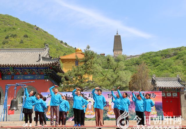 上午九時三十分,應廣大信眾請求,5月1日在鳳凰山祈福園演出過的《佛頌》專場文藝節(jié)目,再度出現(xiàn)在佛寶塔所在的下寺廣場上,而且新加進了兩個別具特色的手語舞節(jié)目——《生命之河》、《中華民族》。演出者來自遼寧省北票市中華傳統(tǒng)文化教育研討會,演員歲數(shù)最大的78歲,最小的只有8歲。