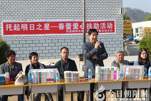 2015年10月16日,由遼寧省朝陽市民進朝陽市委、朝陽市慈善總會主辦的“托起明日之星——春蕾愛心扶助活動”在遼寧省朝陽縣古山子鎮(zhèn)東五家子小學(xué)舉行。此次送教下鄉(xiāng)活動中,民進愛心人士為該校捐助學(xué)生課桌椅250套,捐贈3000元藥品、6000元助學(xué)資金,以及價值5000元圖書筆記本,并為師生體檢身體。