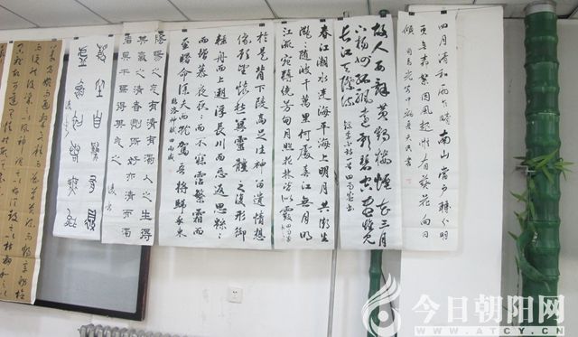 除了花香和書香,校園里還有濃重的墨香,走進(jìn)那間偌大的閱覽室,會(huì)被鋪天蓋地的書法作品所淹沒(méi),這大屋子的四面墻上全都是各種筆體的書法作品,楷書、草書、隸書、篆體等各具風(fēng)格,作者多為省內(nèi)或市內(nèi)書法名家,書法作品楹聯(lián)居多數(shù)。而被譽(yù)為鎮(zhèn)館之寶的作品是王秉德和李煥新兩位老先生合作的《趙尚志賦》,這個(gè)巨幅的書法作品被掩在其他作品的下面,像一件不肯輕易示人的寶貝,蘊(yùn)藏著主人內(nèi)心無(wú)限珍愛(ài)之情。
