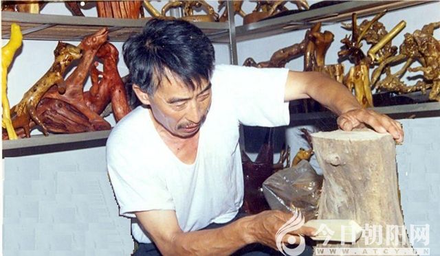 1999年臘月的一天,杜國昌回老家孫家灣鄉(xiāng)小房申村走親,見侄子在自家院子里劈柴禾,身邊一堆奇形怪狀的樹疙瘩引起他的興趣兒,大喊一聲:“別劈了,我有用!”他這一聲喊嚇了侄子一跳,忙停下鎬頭愣愣地看著他。杜國昌讓侄子把這些疙瘩用驢車拉到城里,他要用這樹疙瘩制作根雕。他得到這些“寶貝”后,高興得心花怒放,在家里樂此不疲埋頭雕琢。幾天過去后,一件精美的根雕作品擺在眼前,他心里特別激動。從此,他抽時間便往鄉(xiāng)下跑,在誰家發(fā)現(xiàn)有用的材料,認識的就要,不認識的就買。他到過二十家子鎮(zhèn)、臺子鄉(xiāng)的長茂河子、北票市的金嶺寺等地尋找材料,這些年來花在買材料和工具上的錢己有6000多元。一年四季,他不是走在鄉(xiāng)間的小路上尋找根雕材料,就是在自行車棚改建的工作室里雕刻,努力營造自己獨特的藝術(shù)氛圍。