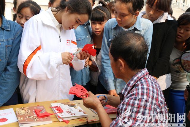 傳承人向?qū)W生傳授剪紙技藝,引來眾多同學的圍觀,展示自己現(xiàn)場制作的剪紙作品,學生非常開心,不斷向傳承人鞠躬致敬,連說:“謝謝,謝謝。”