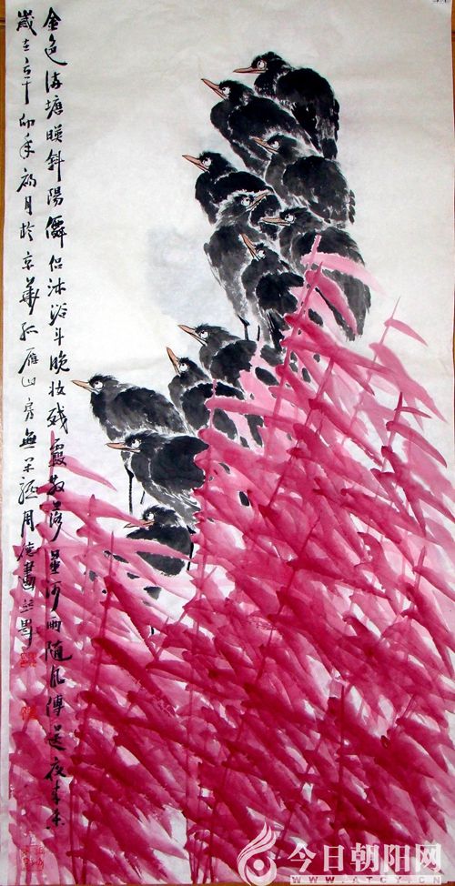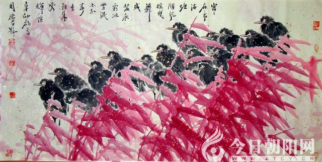 作品是心跡的再現(xiàn),靈魂的吶喊。周德的畫作更多畫的是心境而非物象,是人文而非技巧。他以形寫神,境界深邃,意境開闊,簡括生動,詩情畫意間風行雨散,鳥靜聽音,潤色花開,頗顯心性。墨的濃淡干濕、線的疏密虛實、色的韻致、筆的節(jié)奏以及書寫性的美感都可以折射出他對前人筆墨成就的解讀,滲透著他對繼承和創(chuàng)新的認識與理解。他把扎實的傳統(tǒng)筆墨功夫融入了新的圖式與新的精神表現(xiàn)之中,打破了傳統(tǒng)圖式、筆墨的局限性,彰顯時代氣息,形成了自身鮮明的花鳥畫藝術(shù)特點與個人風格。他的《紅色系列》花鳥作品紅的艷麗不俗,熾情熱烈,黑的深沉高雅,溫潤莊重。他的《墨色系列》花鳥作品畫構(gòu)時代氣息明顯,滿而不充塞,層次豐富而不亂,內(nèi)涵有著極強的文化哲理。同時也發(fā)揮了自己書法之長,筆墨有著自己的個性,一改過去創(chuàng)作精微小品之習(xí),大氣作品也呈精微,境界整體把撐已具品位,內(nèi)涵著極強的文化哲理,彰顯畫家在書法上的修養(yǎng)。(哈爾濱師范大學(xué)藝術(shù)學(xué)院院長高卉民語)。