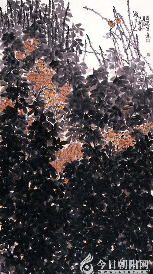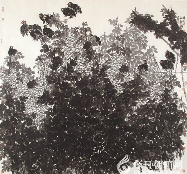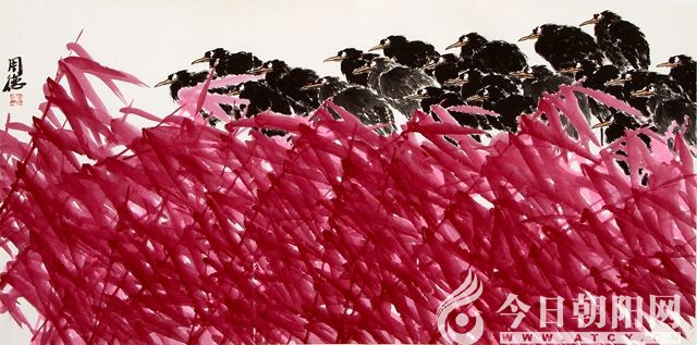 賞析探尋周德花鳥作品的審美情趣,重在剖析他的人文精神。歸納起來有如下三大特點。一是突破傳統(tǒng),走出精而小的瓶頸。周德在最新的作品中摒棄了傳統(tǒng)花鳥畫的一枝一景、一景一格的經(jīng)典構(gòu)圖模式。他把筆墨回歸現(xiàn)實生活中,直接描寫大自然中的花鳥,葉茂鳥靜,還原自然,恬淡閑適,層次清晰,色澤鮮艷,營造出生機盎然的藝術(shù)境界。二是在畫面形態(tài)上實現(xiàn)了質(zhì)的突破。他的作品畫面大方,滿實不塞。筆下花鳥各得其態(tài),相襯相映,靜中有動,動中有靜,靜動相宜。三是繪畫語言的表達豐富多彩。他的作品大多兼工帶寫,筆墨質(zhì)樸蒼潤,工而不滯,寫而不亂,胸襟澄闊,樸厚儒雅,氣韻生動。特別是在鳥兒的神態(tài)刻畫上頗得神韻,雖大抒筆墨,卻不著他色。尤其是色彩的運用很有獨到之處,他繼承和發(fā)揚中國畫的色彩傳統(tǒng),同時吸收西畫重彩優(yōu)點,雖然畫面非紅即黑,少有他色,但墨色卻層層渲染,厚重亮麗,潑彩、漬彩、點彩、灑彩等等手法交相輝映,相映成趣,給讀者留下廣闊的聯(lián)想空間和對自由生活的美妙憧憬。這些原生態(tài)意味的表現(xiàn),傳達出畫家探究人與自然、人類社會與生態(tài)環(huán)境統(tǒng)一和諧的新境界。如他的代表作《紅色系列》,這是一組攝人心魂的經(jīng)典力作,墨色厚重沉穩(wěn),紅色層次明晰,鮮艷奪目。畫面以意境鋪陳,以氣勢鋪陳,以靈感鋪陳,通過對自然的構(gòu)景,抒寫著畫家對生命的渴望和對自由和諧的向往。