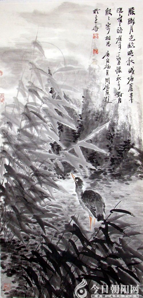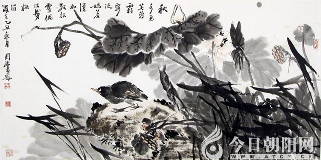 夏天/夢在茂盛的池塘里/內(nèi)心無以言表的喜悅/仿佛還沉浸于昨日的美夢/回憶著已逝的時光/微風拂柳/垂柳的柳絲宛如夢中的帷帳/我那夢的輕紗/一時的情懷/猶如一曲千古傳送的愛情詩章/也許這是一種情感的依托/也許這是焦躁的安慰/望著那盛開萬點的紅妝/我情愿把夢/深系在那難忘的荷塘。這既是一首詩,又是一幅畫,這是一位丹青才俊用筆墨渲染出的一幅《清塘荷韻》。作者就是曾榮獲2010年度中國最具收藏潛力書畫家稱號的花鳥畫家周德先生。