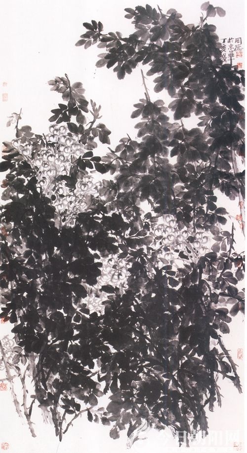 筆墨當隨時代,作品貴在出新。周德對花鳥畫的創(chuàng)作有自己獨特的感悟和語言,他選擇了在傳統(tǒng)的氛圍中從新解讀傳統(tǒng),從傳統(tǒng)中尋找新的出發(fā)點,實現(xiàn)舊法出新意。所以他將錘煉精湛的筆墨放在首位,注重畫外功夫的營養(yǎng)積蓄和對新技法的吸收和運用,使其作品既有傳統(tǒng)功底又具有現(xiàn)代意味,他在繼承傳統(tǒng)繪畫的形態(tài)中與時俱進,不斷走向現(xiàn)代,營造出嶄新的水墨語境。賞讀周德花鳥作品,不難看出,他的作品深得吳葆真、吳昌碩、任伯年的筆墨影響,但又不同于大師的筆墨。他勇于推陳出新,汲取傳統(tǒng)精華,又具備時代創(chuàng)新精神。從他近幾年的花鳥作品創(chuàng)作中可以發(fā)現(xiàn),他特別強調(diào)獨特的筆墨符號。如他的“紅色系列•四條屏”作品,紅的張揚,黑的厚重,語境中傳達出自然和諧與生命之重。你能從中感受到他執(zhí)著在傳統(tǒng)與創(chuàng)新中徘徊,從中尋找藝術(shù)的張力和自然的親和力,使自己的畫作在兩極的兼顧中體現(xiàn)筆墨的深厚性,展示著中國畫筆情墨韻的獨特表現(xiàn)力與美感。