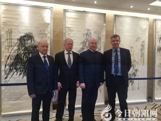 楊竹夫婦與住俄羅斯大使王開文(中)在作品前合影