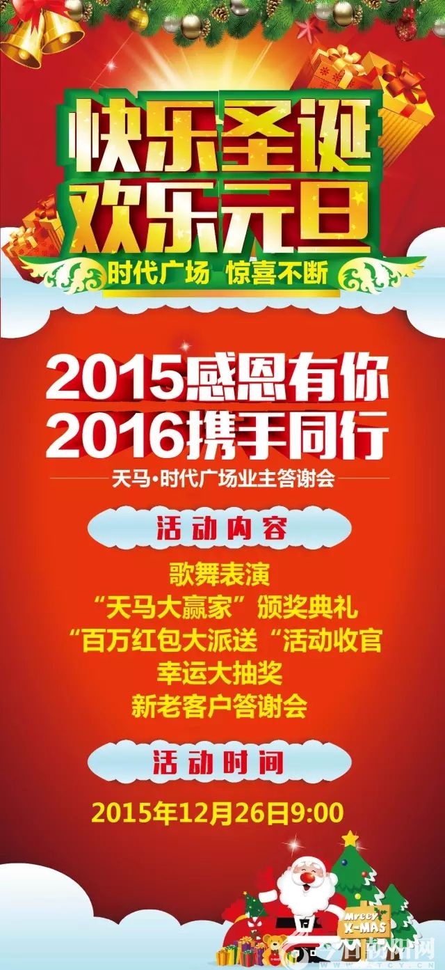 借由“誕+旦”的良好契機(jī),恰逢時(shí)代廣場(chǎng)購物中心產(chǎn)權(quán)金鋪傾城熱賣,我們將于2015年12月26日在售樓處舉辦“2015感恩有你·2016攜手同行”天馬·時(shí)代廣場(chǎng)業(yè)主答謝會(huì)活動(dòng),有精彩表演、有超級(jí)豪禮、有幸運(yùn)抽獎(jiǎng)、有百萬紅包的收官活動(dòng)……
