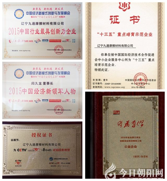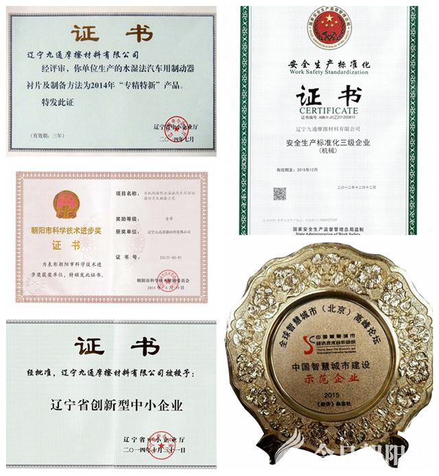 九通已成為中國汽車工業(yè)協(xié)會理事單位、中國汽車工業(yè)協(xié)會制動器分會常務(wù)副理事長單位、中國摩擦材料密封材料協(xié)會會員單位、CCTV央視創(chuàng)新千家組成計劃扶持單位、中國經(jīng)濟日報社創(chuàng)新驅(qū)動宣傳入選單位、中國經(jīng)濟新模式創(chuàng)新與發(fā)展峰會2015年入選單位、“十三五”重點培育示范企業(yè),九通公司已列為國家新材料重點儲備項目。
