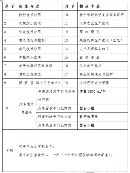 普通專業(yè)不享受免學(xué)費(fèi)學(xué)生,每學(xué)期學(xué)費(fèi)1200元;高中一年制學(xué)生不免學(xué)費(fèi),每學(xué)期學(xué)費(fèi)1200元;中德諾浩汽車機(jī)電服務(wù)技師班學(xué)費(fèi)3850元/年。