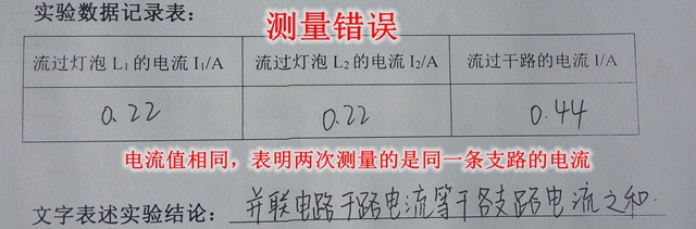4、現(xiàn)象:測(cè)量并聯(lián)電路電流規(guī)律時(shí),測(cè)量錯(cuò)誤,如反復(fù)測(cè)量同一支路或干路電流,測(cè)量的兩個(gè)支路電流相同如圖d-3.(由于實(shí)驗(yàn)中使用的小燈泡規(guī)格不同,兩條支路的電流不相同)