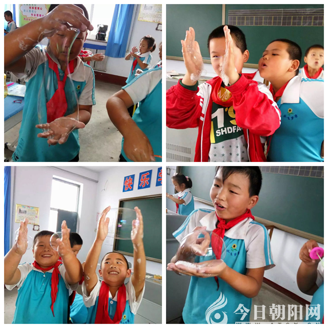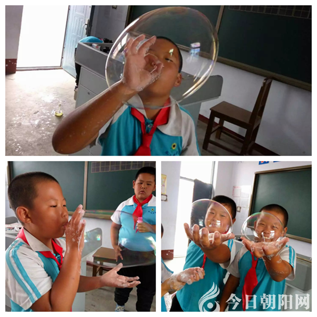 今天學了冰心奶奶的《吹泡泡》,下課后我和孩子們一起吹泡泡。孩子們那叫一個高興,豈是手舞足蹈可以形容的。先是武春旭拿了一個小瓶,里邊有泡泡水,孩子們相互借著吹,不過癮。于是我又在四年級借來了幾個吸管,有長的、短的,有黃的、白的。剛拿過來就被孩子們一搶而光。滕航宇小腦瓜真好使,竟然把自己的油筆管拿出來吹。杜新宇覺得小瓶的泡泡水不足以發(fā)揮水平,于是用臉盆和了一些洗衣粉又加上一些洗手液,還別說,這一招真好使,大家都可以玩吹泡泡了。