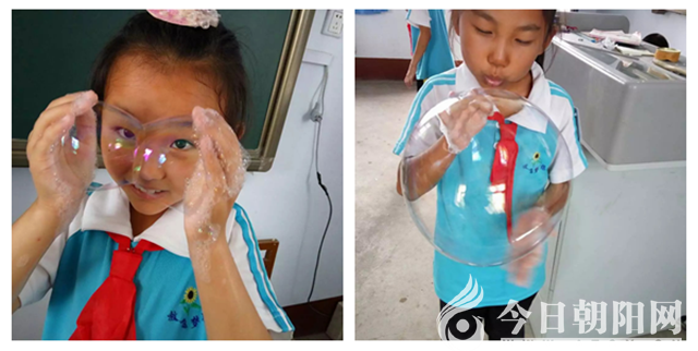 再來看看咱們的女孩子,她們也不輸于男孩。王凱然吹的多專心,生怕她的泡泡不夠大,那撅起的小嘴多好看。王敏多會玩,她用泡泡制作了一副大眼睛,這透明的眼鏡多時髦?。?/span>