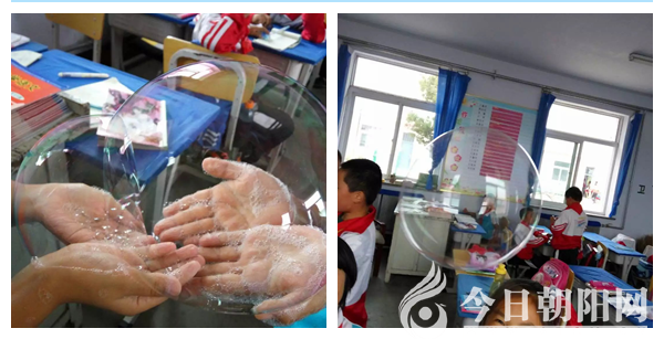 論玩男同學還是高手頗多??纯瘩T文順吹的長長的橢圓形的大泡泡,晶瑩透明,像一個透明的大氣球,旁邊的武春旭看得多專注。哎呀,馮文順又吹出了一個圓圓的大泡泡,雙手捧著像大水晶球,比他的腦袋還大。馮文順笑得露出了一口小白牙,一對小酒窩很顯眼。鞠國慶也吹出了一個大泡泡和馮文順媲美,鞠國慶說:“看看咱倆誰的泡泡大。”