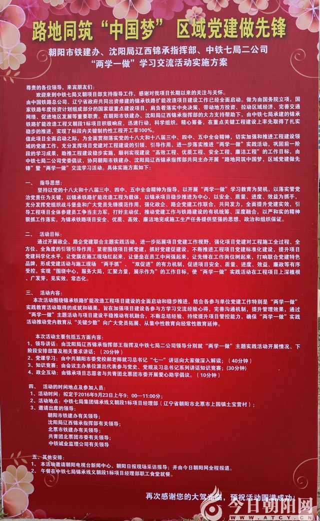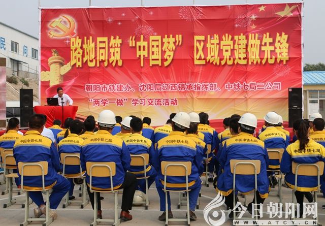 9月23日上午,遼西大丘陵,惠風(fēng)和暢,萬里祥光。一場以“路地同筑‘中國夢’,區(qū)域黨建做先鋒”為主題的“兩學(xué)一做”學(xué)習(xí)交流活動,在位于遼寧省北票市上園鎮(zhèn)土寶營村的中鐵七局錦承鐵路擴(kuò)能改建義朝段1標(biāo)項目部隆重舉行。