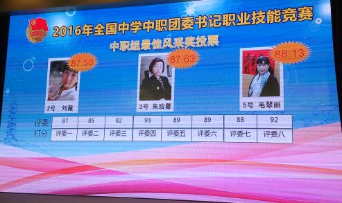 11月30日,由團(tuán)中央學(xué)校部主辦、共青團(tuán)海淀區(qū)委教育工委承辦的2016年全國中學(xué)中職學(xué)校團(tuán)委書記職業(yè)技能競賽決賽,在北京理工大學(xué)附屬中學(xué)如期舉行。來自全國各地中學(xué)組和中職組的參賽選手們,通過專家評(píng)審和大眾評(píng)審?fù)镀?,產(chǎn)生了中學(xué)組和中職組冠、亞、季軍。經(jīng)過激烈角逐,來自遼寧朝陽工程技術(shù)學(xué)校的團(tuán)委書記毛翠麗,一舉斬獲中職組冠軍。