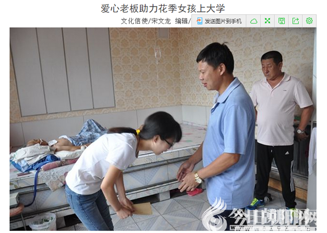 8月22日,龍城區(qū)政協(xié)委員、朝陽平凡鋼球模具制造廠總經(jīng)理趙平凡把3000元愛心善款,送到了即將邁入大學(xué)校門的劉紅葉手中,劉紅葉感動得潸然淚下。筆者得知劉紅葉一家的不幸遭遇后,相繼在《今日朝陽網(wǎng)》、《朝陽日報》、《燕都晨報》等多家媒體作了報道,立時引起了社會各界愛心人士的高度關(guān)注,大家紛紛施以援手,鼓勵她一定要完成學(xué)業(yè),將來成為有益于社會的有用之才,回報社會、報效祖國。