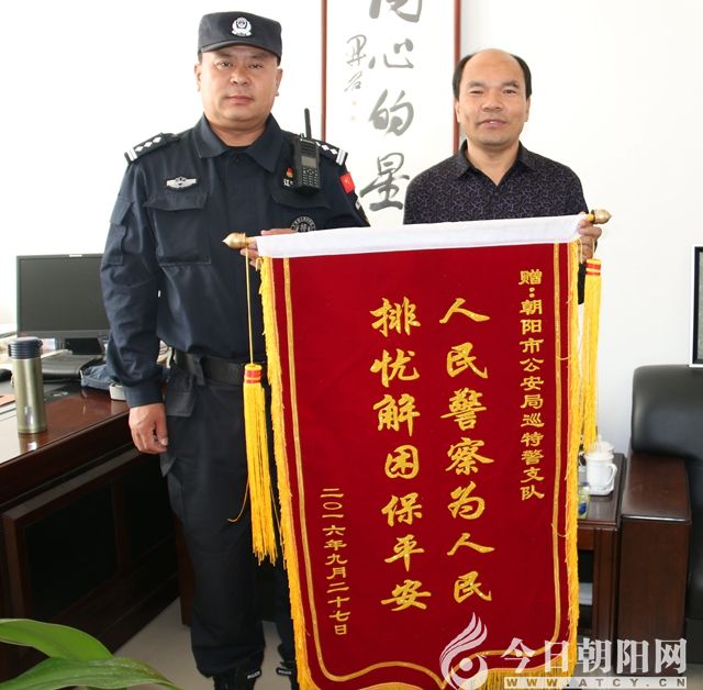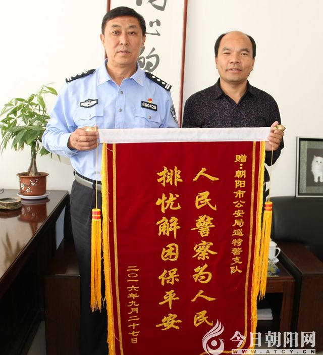 9月27日,小編跟隨陳作福一行,前往朝陽市公安局巡特警支隊(duì),為他們送去了印有“人民警察為人民,排憂解困保平安”字樣的錦旗,以感恩他們的無私奉獻(xiàn),及時(shí)援救,化解危難。