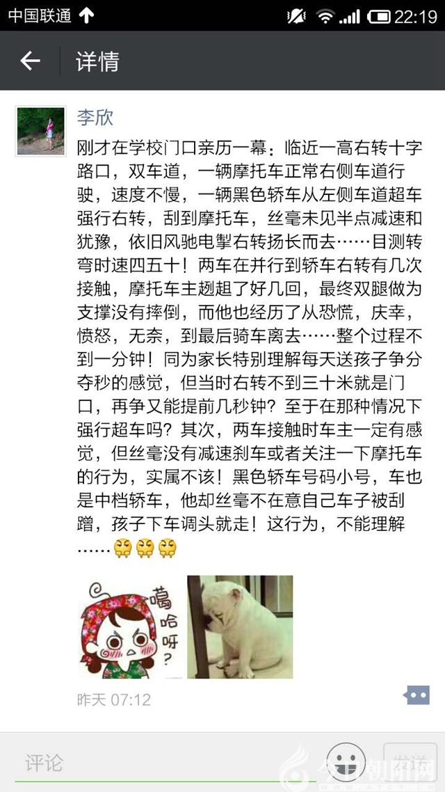 忽然想起曾在微信朋友圈看到微友李欣在“說說”中記述的一段文字:“剛才在學校門口親歷一幕:臨近一高右轉(zhuǎn)十字路口,雙車道,一輛摩托車正常右側(cè)車道行駛,速度不慢,一輛黑色轎車從左側(cè)車道超車強行右轉(zhuǎn),刮到摩托車,絲毫未見半點減速和猶豫,依舊風馳電掣右轉(zhuǎn)揚長而去……目測轉(zhuǎn)彎時速四五十(邁)!兩車在并行到轎車右轉(zhuǎn)有幾次接觸,摩托車主趔趄了好幾回,最終雙腿做為支撐沒有摔倒,而他也經(jīng)歷了從恐慌、慶幸、憤怒、無奈,到最后騎車離去……整個過程不到一分鐘!同為家長,特別理解每天送孩子爭分奪秒的感覺,但當時右轉(zhuǎn)不到三十米就是門口,再爭又能提前幾秒鐘?至于在那種情況下強行超車嗎?其次,兩車接觸時車主一定有感覺,但絲毫沒有減速剎車或者關(guān)注一下摩托車的行為,實屬不該!黑色轎車號碼小號,車也是中檔轎車,他卻絲毫不在意自己車子被刮蹭,孩子下車調(diào)頭就走!這行為,不能理解……”