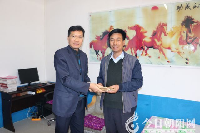 圖為張弢(左)將2萬(wàn)元資助金交給舊燒鍋村村支部書記岳中生