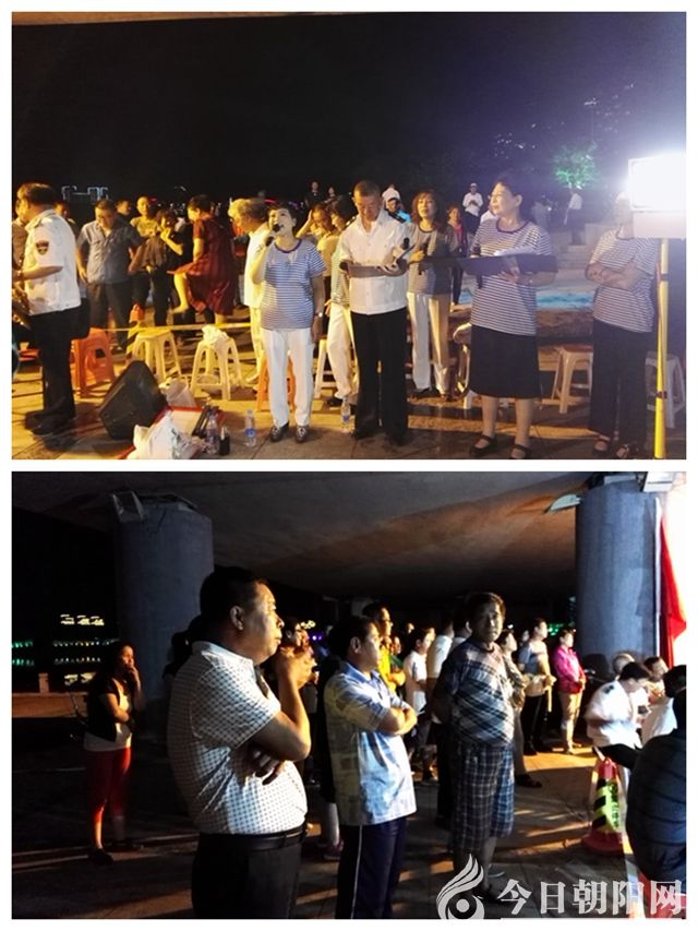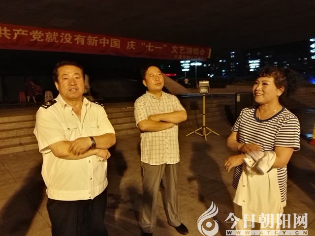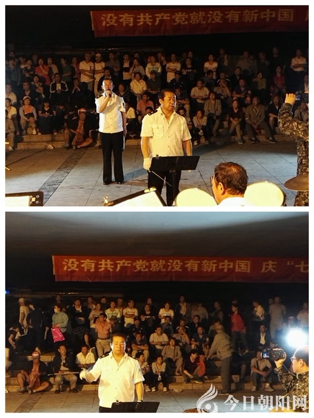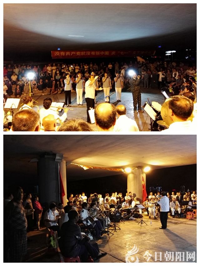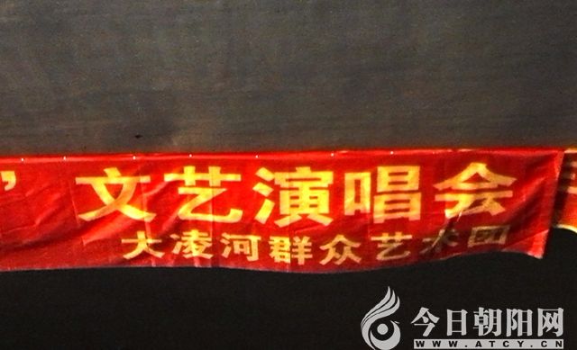 快到麒麟大橋時,遠遠地,被一陣雄壯激昂的歌聲吸引??拷?,但見大橋下面,聚集了至少千余人。一支規(guī)模不小的樂隊正吹打彈拉,幾位身著演出服裝的中年人正齊聲高唱經(jīng)典名曲——《映山紅》。再走近了細看,發(fā)現(xiàn)橋墩上掛著一條橫幅“沒有共產(chǎn)黨就沒有新中國‘慶七一’文藝演唱會”,與之位置相對的,是兩面鮮艷的國旗和黨旗。定睛觀瞧,演出單位是“大凌河群眾藝術團”。