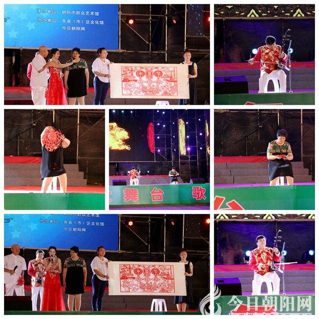 接下來,藝術(shù)剪紙二胡演奏《剪窗花》,獨(dú)唱《谷雨》,古箏與沙畫,脫口秀表演《今夜我做主》等精品節(jié)目紛紛登場(chǎng),分別由喀左縣、雙塔區(qū)、建平縣文化館,以及朝陽市群眾藝術(shù)館選送。這些精心排練、千挑萬選的精品節(jié)目,讓人眼花繚亂,目不暇接,深感過癮。緊接著,由張國(guó)艷老師獨(dú)唱、徐鐵舞蹈工作室伴舞的《九鳳朝陽》,將演出推向一個(gè)高潮。