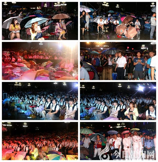 然而,這場(chǎng)不期而至的大雨,絲毫沒有影響正在今朝輝煌萬(wàn)人廣場(chǎng)舉行的文藝演出——由朝陽(yáng)銀行全體員工出演的慶祝建黨95周年紅歌專場(chǎng)文藝晚會(huì)。讓人熱血沸騰的是,彌天接地的大雨,不僅沒有阻斷演出,沒有驅(qū)散演職人員,沒有澆跑熱心觀眾,更沒有趕走媒體工作者。