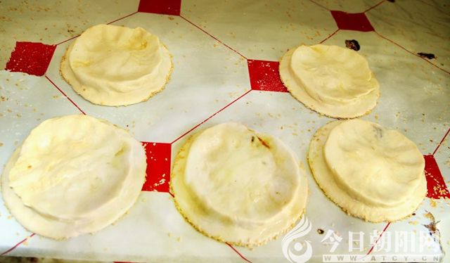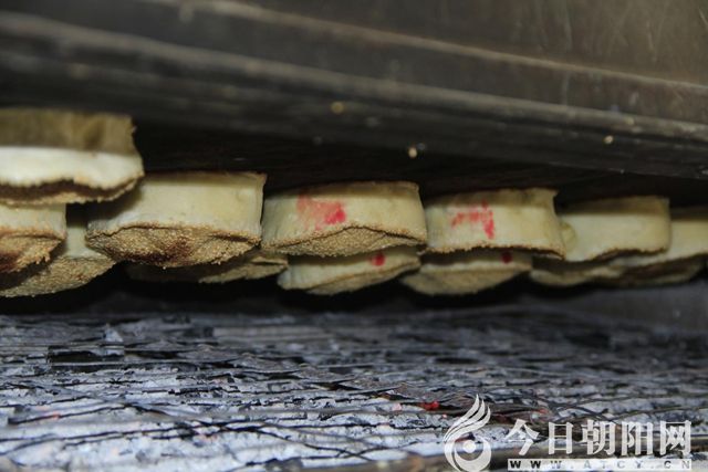 烤制過程中的燒餅,點紅點的帶糖的,不點紅點的是無糖。