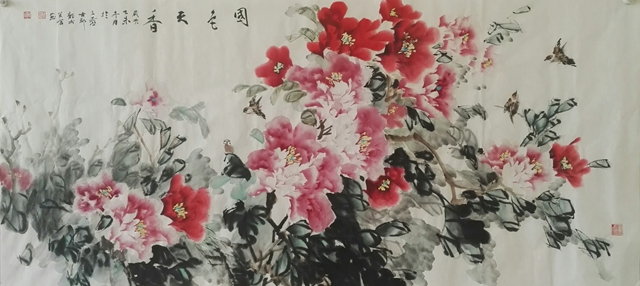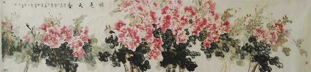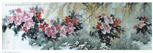 他這次參評的《牡丹圖》作品,是一幅丈二條作品,色調雅致和諧,花木欣欣向榮,有萬木爭春之勢。評委給出的金獎理由是:高雅中和,氣韻神通,虛實相生,率性含情,賦予了時代積極向上的精神和生命的張力,架構了一幅盛世和諧的景象。