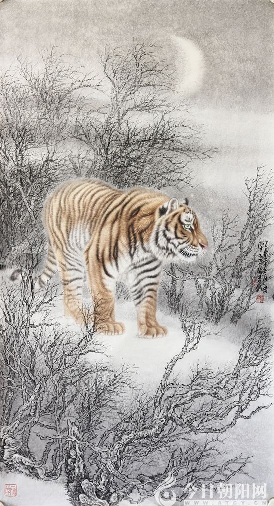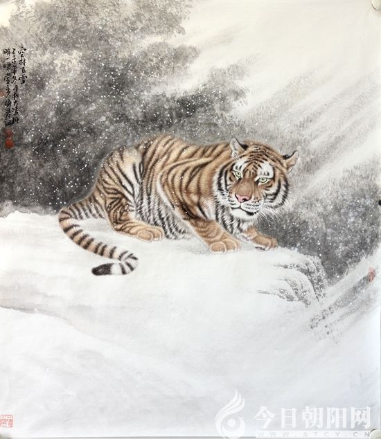 伊海軍是一位因虎殘疾,因虎結(jié)緣,因虎成名的關(guān)東現(xiàn)實(shí)主義畫(huà)家,他是繼李笑如、馮大中、邢世靖之后,關(guān)東大地涌現(xiàn)出的又一位畫(huà)虎名家。他筆下的老虎體態(tài)雄健、威嚴(yán)狹義;性格溫和、慈善敦厚;毛色純凈、形神兼?zhèn)?,具有王者之氣?ldquo;無(wú)愧獸王嘯山林,俯看澗壑聽(tīng)泉音。峰巔獨(dú)屹一聲吼,撼動(dòng)夜空顯雄魂。”這既是一首詠虎詩(shī),也是伊海軍筆下的一幅詠虎畫(huà)。讀之雄渾威武,心生敬慕;觀之獨(dú)具匠心,懾人心魂。