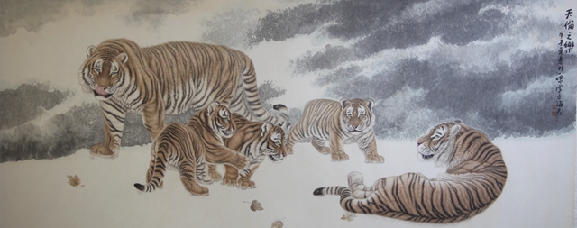 畫(huà)虎,似在形,貴在神,妙在景,絕在韻,難在骨。伊海軍的作品實(shí)現(xiàn)了有骨有肉,氣足韻豐?!短靷愔畼?lè)》是伊海軍甲子年新作,作品大氣渾厚,精妙沉雄,結(jié)構(gòu)精美舒展,處處洋溢著和諧溫馨的天倫氛圍,這是他二次變法以來(lái)最難得的佳作,他成功打破了工筆與寫(xiě)意的壁壘,營(yíng)造出自然界濃郁的生活氣息。這是思變的結(jié)晶,這是傳承的果實(shí),印證了畫(huà)家的聰慧和學(xué)養(yǎng)。畫(huà)面雌雄兩只成年虎一臥一立,細(xì)筆行云流水,清晰嫻熟,結(jié)實(shí)韌性,減少了霸氣,增添了和氣;老虎的肌肉和骨骼表現(xiàn)的真實(shí)生動(dòng),肢體曲凹突兀處,隱顯虎之骨骼,展現(xiàn)虎在不同姿態(tài)下的神韻。三只幼虎敦厚可愛(ài),憨態(tài)可掬,栩栩如生。骨肉關(guān)系明晰可見(jiàn),舐?tīng)僦檐S然紙上,真正讓讀者感受到了筆筆有親情,筆筆有意趣,形象展現(xiàn)了美獸的溫情畫(huà)面。虎圖背景配置是近期伊海軍作品實(shí)現(xiàn)突破的新課題。他化繁為簡(jiǎn),以潑墨為主,渲染墨韻,突出主題,地上幾片楓葉與朦朧遠(yuǎn)景呼應(yīng),虛實(shí)對(duì)比,濃淡對(duì)比,繁簡(jiǎn)對(duì)比都相得益彰。這幅作品的成功并非偶然,一方面源于伊海軍長(zhǎng)期對(duì)東北虎環(huán)境的關(guān)注。他的創(chuàng)作素材完全來(lái)源于生活,他曾兩度在沈陽(yáng)、秦皇島、牡丹江橫道河子寫(xiě)生,在野生動(dòng)物保護(hù)基地觀察東北虎生活習(xí)性,骨骼形狀。另一方面是他對(duì)藝術(shù)的感悟和筆墨的提煉。他認(rèn)為,感受的真實(shí)比實(shí)物本身的真實(shí)更可貴。他在創(chuàng)作中,常常把虎爪,虎胯和虎的五官進(jìn)行合理有效的放大夸張,使藝術(shù)高于生活,讓讀者真實(shí)感受到他作品中的老虎遠(yuǎn)比大自然中的真虎更美麗,更健壯,更威武。
