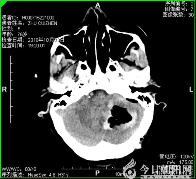 患者女性,今年76歲。2016年10月22上午11點,突發(fā)劇烈頭疼,伴嘔吐咖啡色液體數(shù)次,120接診至該院急診,處于嗜睡狀態(tài),尿便失禁,呼吸急促,病情危急。該患者既往高血壓病史6年,腦梗死病史6年,糖尿病病史10年。