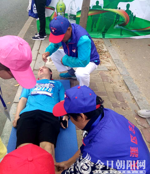 11組志愿者看到救護(hù)站醫(yī)護(hù)志愿者忙不過來,就過去幫忙,并把最后一名運(yùn)動員護(hù)送到終點(diǎn)。