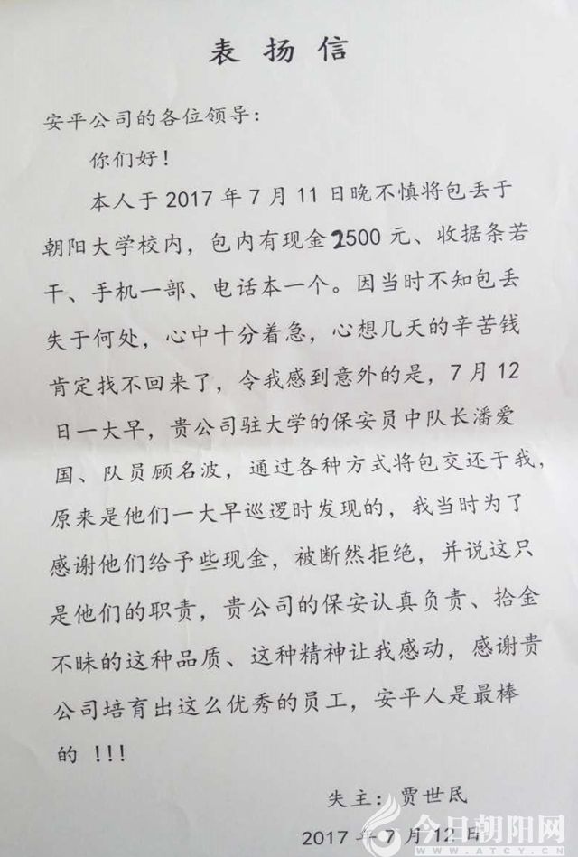 7月11日晚間,朝陽安平集團駐朝陽師專保安二中隊隊長潘愛國和隊員顧明波像往常一樣在校園內(nèi)巡邏。突然間,在一食堂附近,他們發(fā)現(xiàn)了一個黃色背包。二人沒有遲疑,馬上把背包交給了學校保衛(wèi)處值班隊長,幾人共同清點了里面的物品,內(nèi)有現(xiàn)金2500元,收據(jù)條若干,手機1部,電話本1個。他們想到,失主丟失了這些東西,此刻一定很著急,幾個人連夜想盡各種辦法聯(lián)系失主。
