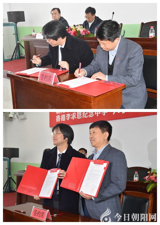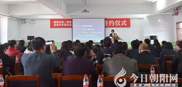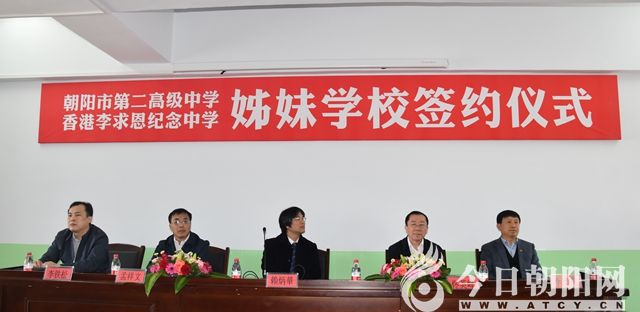 隨后,簽約儀式開(kāi)始。李文龍?jiān)跉g迎詞中說(shuō):“在這春意盎然、充滿(mǎn)希望的美好時(shí)節(jié),我們榮幸地迎來(lái)了來(lái)自‘東方之珠’的尊貴客人,到我校參觀考察。首先,我代表學(xué)校4242名師生、員工,對(duì)香港朋友和各位領(lǐng)導(dǎo)、各位同仁的到來(lái)表示熱烈的歡迎。香港李求恩紀(jì)念中學(xué)是一所具有愛(ài)國(guó)、愛(ài)崗光榮傳統(tǒng),文化底蘊(yùn)厚重,教育理念先進(jìn)的著名中學(xué)。在大家的見(jiàn)證下,朝陽(yáng)市第二高中和香港李求恩紀(jì)念中學(xué)將簽訂友好姊妹學(xué)校。祝香港的朋友們?cè)诔?yáng)期間平安、順利、愉快。”