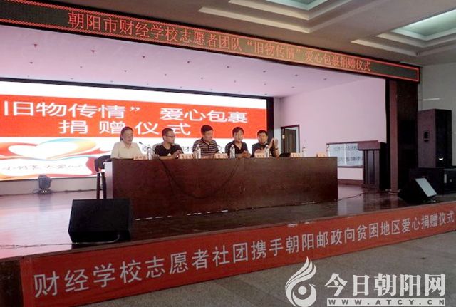 朝陽郵政局營業(yè)分局包件分局科室主任安振國和營業(yè)分局辦公室主任潘曉旭參加活動。財經(jīng)學(xué)校團委副書記延啊巍主持捐贈儀式。